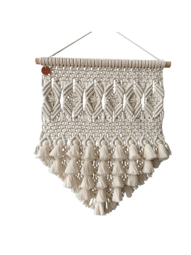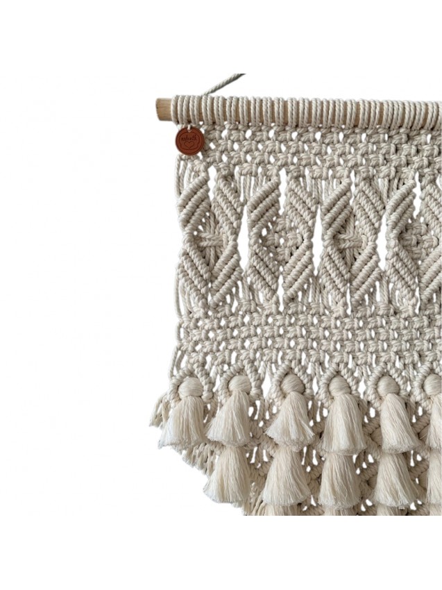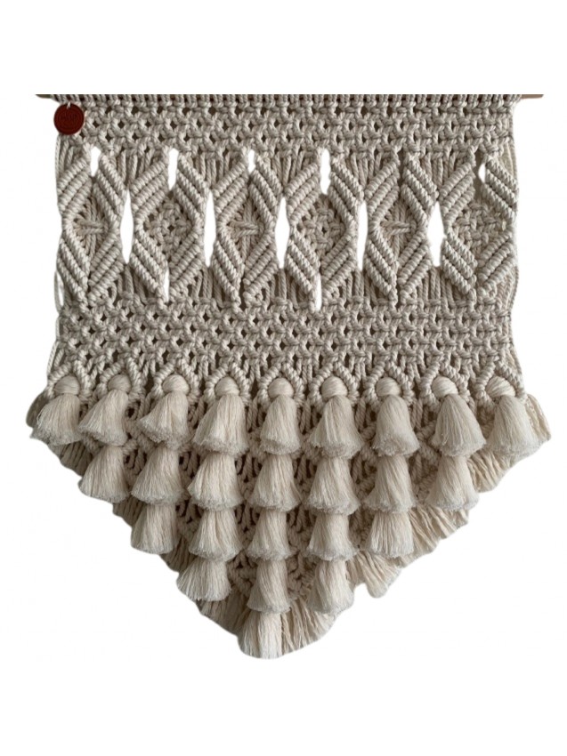 Deze prachtige muurhanging is gemaakt van 100% natuurlijk en hoogwaardig gedraaid katoenen touw en hangt aan een houten plug.